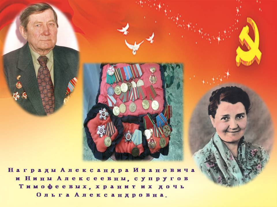 Награды Александра Ивановича и Нины Алексеевны, супругов Тимофеевых, хранит их дочь Ольга Александровна.