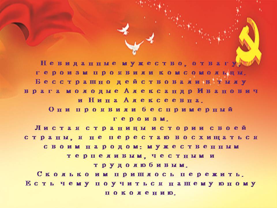 Невиданные мужество, отвагу, героизм проявили комсомольцы. Бесстрашно действовали в тылу врага молодые Александр Иванович и Нина Алексеевна.