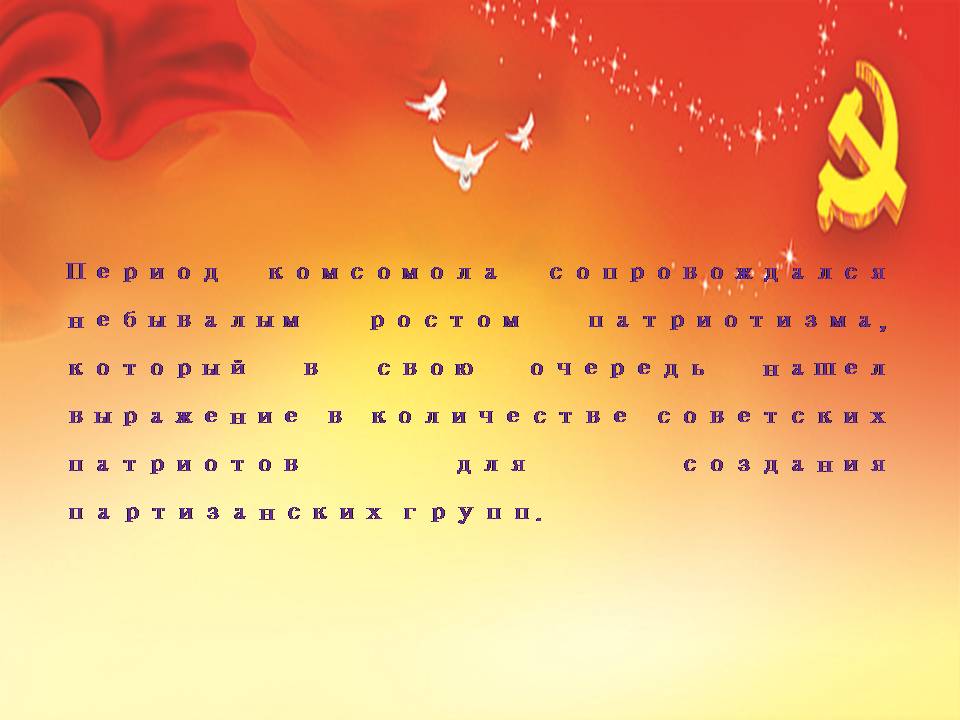 Период комсомола сопровождался небывалым ростом патриотизма, который в свою очередь нашел выражение в количестве советских патриотов для создания партизанских групп.