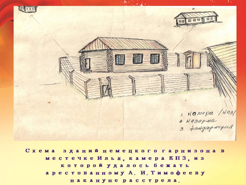 Схема зданий немецкого гарнизона в местечке Илья, камера КПЗ, из которой удалось бежать арестованному А. И.Тимофееву накануне расстрела.