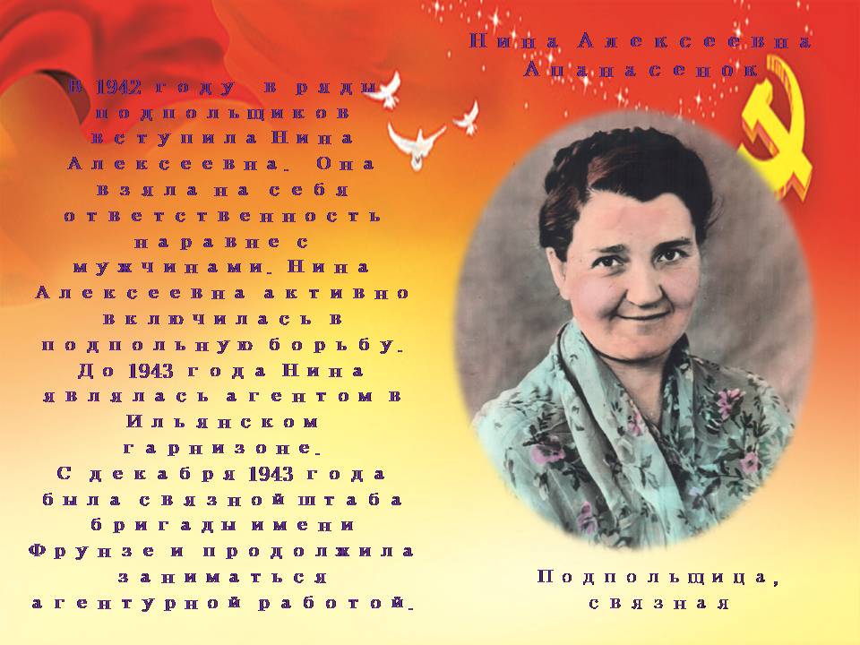 В 1942 году в ряды подпольщиков вступила Нина Алексеевна Апанасенок.