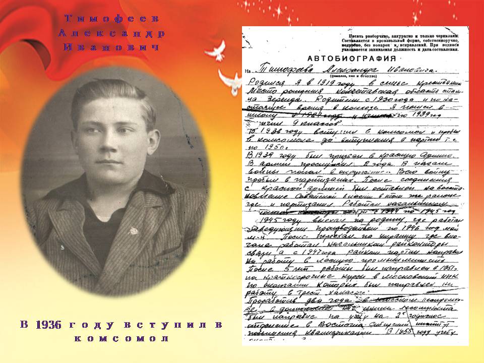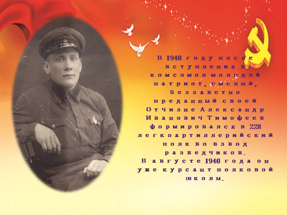 В 1940 году после вступления в комсомол молодой патриот, смелый, беззаветно преданный своей Отчизне Александр Иванович Тимофеев формировался в 228 легкоартиллерийский полк во взвод разведчиков.
