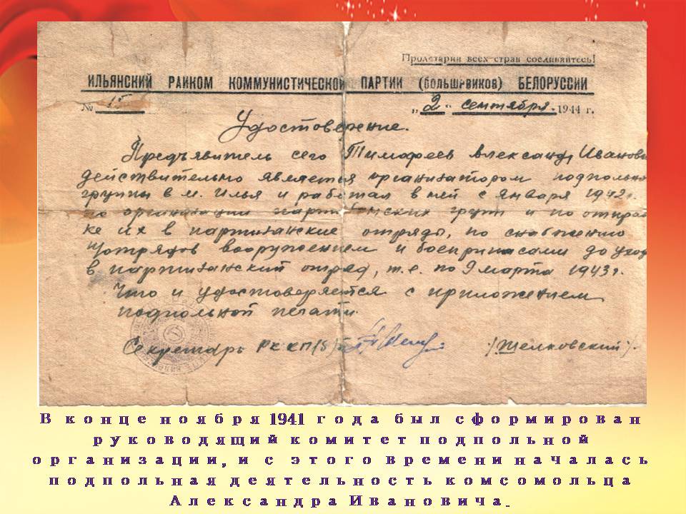 В конце ноября 1941 года был сформирован руководящий комитет подпольной организации, и с этого времени началась подпольная деятельность комсомольца Александра Ивановича Тимофеева.